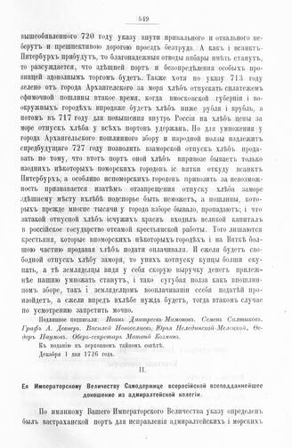 Приложение к протоколу Верховного тайного совета от 20 декабря 1726 г. Ее Императорскому Величеству Самодержице Всероссийской всеподданнейшее доношение из адмиралтейской коллегии. 13 октября 1726 г. [1]
