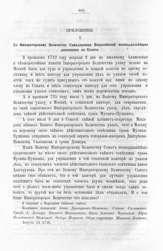 Приложение к протоколу Верховного тайного совета от 23 декабря 1726 г. Ее Императорскому Величеству Самодержице Всероссийской всеподданнейшее доношение из Сената. 12 августа 1726 г.