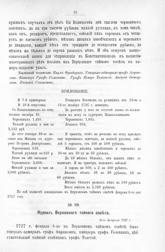 Приложение к Протоколу Верховного тайного совета от 8-го февраля 1727 г. Ведомость вещам и деньгам. 1727 г.