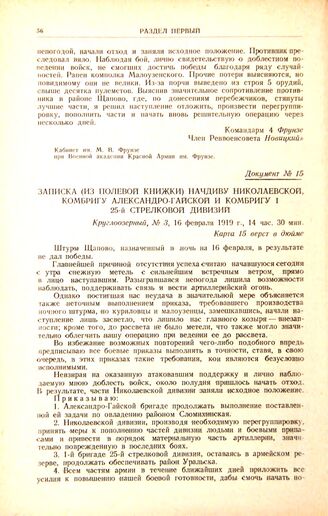 Записка (из полевой книжки) начдиву Николаевской, комбригу Александро-Гайской и комбригу 1 25-й стрелковой дивизий. Круглоозерный, № 3, 16 февраля 1919 г., 14 час. 30 мин // Кабинет им. М.В. Фрунзе при Военной академии Красной Армии им. Фрунзе.