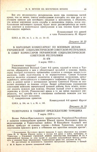 Телеграмма в Ташкент председателю Туркцика. 7 марта 1919 г. // ЦАКА, ф. 184, оп. 1, л. 25, ч. Ill, лл. 107—108.