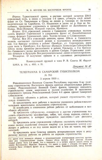Телеграмма в Самарский губисполком. № 763. 3 апреля 1919 г. // ЦАКА, ф. 184, оп. 1, д. 25, ч. II!, л. 210.
