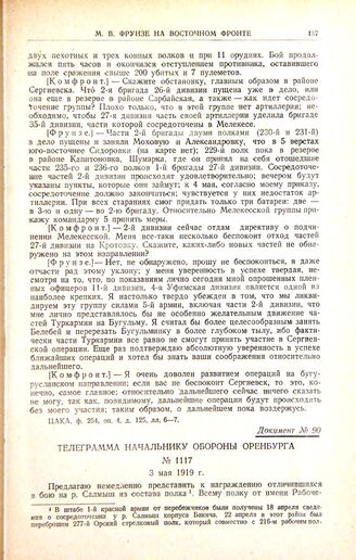 Телеграмма начальнику обороны Оренбурга. № 1117. 3 мая 1919 г. // ЦАКА, ф. 106, д. 8168, л. 75.