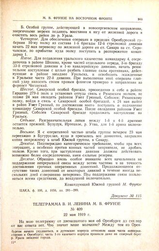Телеграмма В.И. Ленина М.В. Фрунзе. № 409. 22 мая 1919 г. // ЦАКА, ф. 254, оп. 4, д. 73, л. 147.