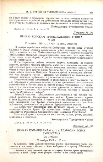 Приказ войскам Туркестанского фронта. № 057. 15 ноября 1919 г., 13 час. 10 мин., Оренбург // ЦАКА, ф. 184, оп. 3, д. 78, лл. 4—5.
