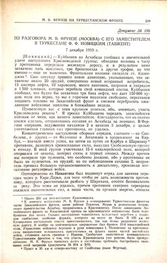Из разговора М.В. Фрунзе (Москва) с его заместителем в Туркестане Ф.Ф. Новицким (Ташкент). 7 декабря 1919 г.
