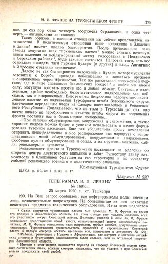 Телеграмма В И. Ленину. № 160/оп. 25 марта 1920 г., ст. Ташкепри // М.В. Фрунзе, Собр. соч., т. I, стр. 123—124.