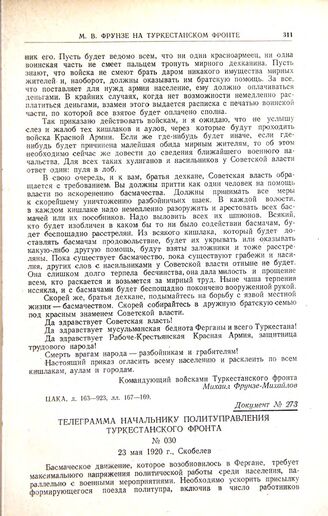 Телеграмма начальнику политуправления Туркестанского фронта. № 030. 23 мая 1920 г., Скобелев // ЦАКА, ф. 110, оп. 1, д. 106, лл. 271—272.