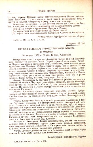 Приказ войскам Туркестанского фронта. № 00224/пш. 30 августа 1920 г., 9 час. 45 мин., Самарканд // ЦАКА, ф. 110, оп. 1, д. 7/с, л. 392.