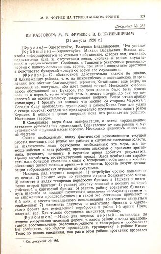 Из разговора М.В. Фрунзе с В.В. Куйбышевым. [31 августа 1920 г.] // ЦАКА, ф. 110, оп. 1, д. 6/с, лл. 36—37.