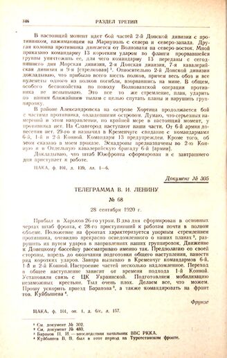 Телеграмма В.И. Ленину. № 68. 28 сентября 1920 г. // ЦАКА, ф. 101, оп. 1, д. 6/с, л. 157.