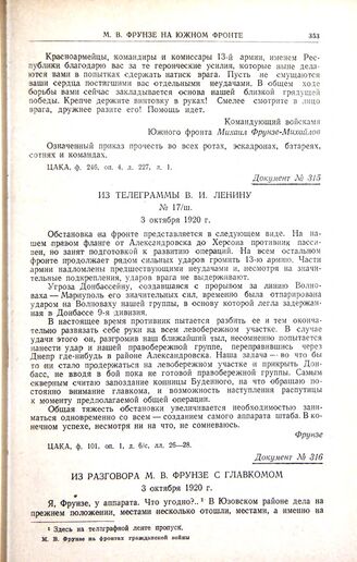 Из телеграммы В.И. Ленину. № 17/ш. 3 октября 1920 г. // ЦАКА, ф. 101, оп. 1, д. 6/с, лл. 26—28.