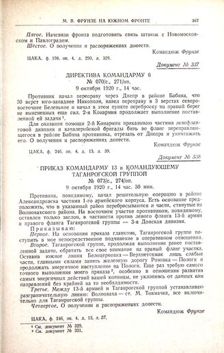 Приказ командарму 13 и командующему Таганрогской группой. № 073/с., 274/оп. 9 октября 1920 г., 14 час. 30 мин // ЦАКА, ф. 246, оп. 4, д. 13, л. 37.