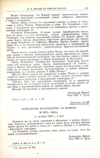Телеграмма командарму 2-й конной. № 087/с., 303/оп. 11 октября 1920 г., 4 часа // ЦАКА, ф. 246, оп. 4, д. 13, л. 47.