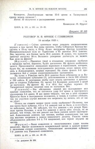 Разговор М.В. Фрунзе с главкомом. 14 октября 1920 г. // ЦАКА, ф. 101, д. 139, лл. 48—55.