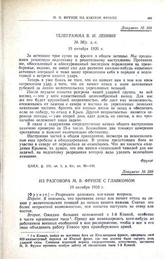 Из разговора М.В. Фрунзе с главкомом. 19 октября 1920 г.
