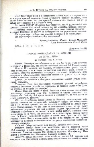 Главная М.В. Фрунзе на фронтах гражданской войны Документы Приказ командарму 2-й конной. № 0175/с., 537/оп. 20 октября 1920 г....