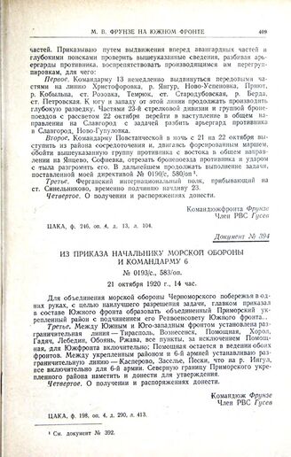 Из приказа начальнику морской обороны и командарму 6. № 0193/с., 583/оп. 21 октября 1920 г., 14 час // ЦАКА, ф. 198, оп. 4, д. 290, л. 413.