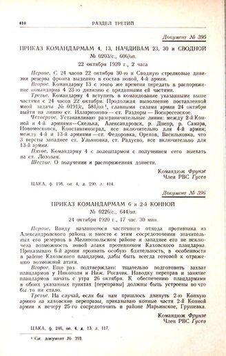 Приказ командармам 4, 13, начдивам 23, 30 и сводной. № 0203/с., 606/оп. 22 октября 1920 г., 2 часа // ЦАКА, ф. 198. оп. 4, д. 290. л. 414.
