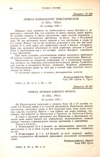 Приказ армиям Южного фронта. № 258/с., 788/оп. 28 октября 1920 г. // ЦАКА, ф. 101, д. 136, л. 11.