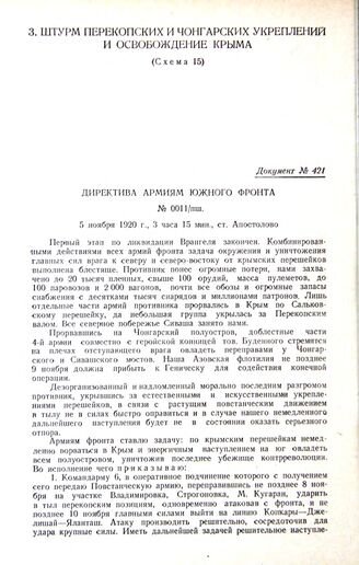 Директива армиям Южного фронта. № 0011/пш. 5 ноября 1920 г., 3 часа 15 мин., ст. Апостолово // ЦАКА, ф. 101, д. 136, л. 16.