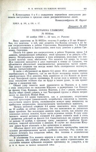 Телеграмма главкому. № 0034/пш. 10 ноября 1920 г., 22 часа, ст. Рыково // ЦАКА, ф. 101, д. 135, лл. 132—134.