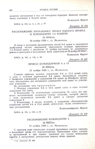Распоряжение командарму 4. № 0057/пш. 11 ноября 1920 г., ст. Мелитополь // ЦАКА, ф. 101, д. 182, л. 46.