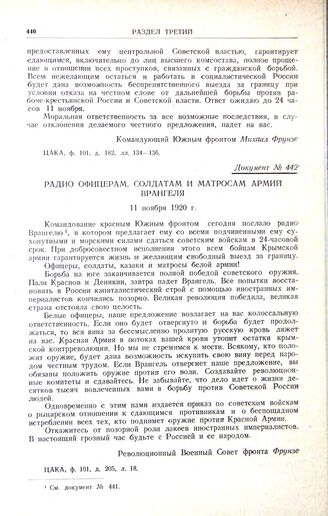 Радио офицерам, солдатам и матросам армий Врангеля. 11 ноября 1920 г. // ЦАКА, ф. 101, д. 205, л. 18.