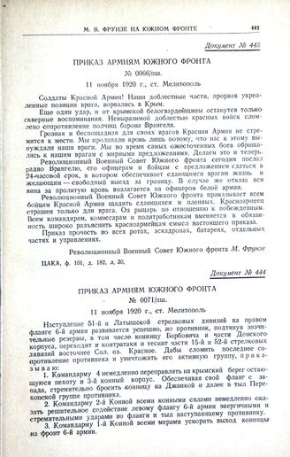 Приказ армиям Южного фронта. № 0071/пш. 11 ноября 1920 г., ст. Мелитополь // ЦАКА, ф. 101, д. 135, л. 109.