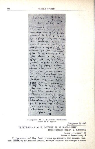 Телеграмма М.В. Фрунзе М.И. Калинину // Музей Красной Армии, инв. № 15751.