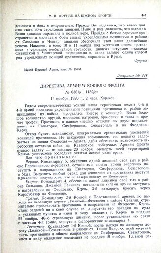 Директива армиям Южного фронта. № 0361/с., 1132/оп. 13 ноября 1920 г., 2 часа, Харьков // ЦАКА, ф. 189, оп. 4, д. 153, лл. 28—29.