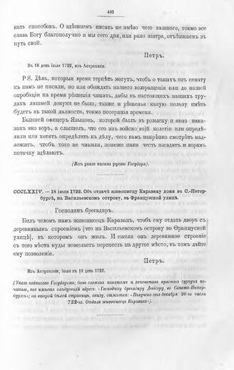Высочайшие указы и повеления Императора Петра I, данные правительствующему сенату. Об отдаче живописцу Караваку дома в С.-Петербурге, на Васильевском острове, в Французской улице. Из Астрахани, июля в 18 день 1722 // Из архива правительствующего сената.