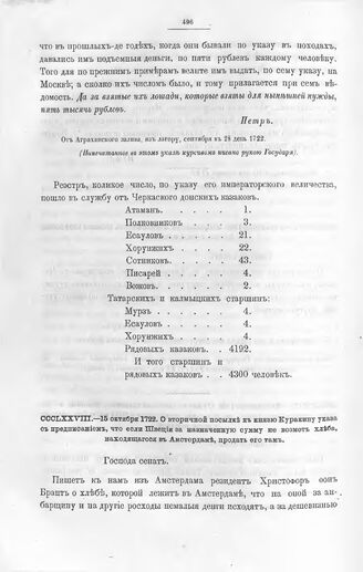 Высочайшие указы и повеления Императора Петра I, данные правительствующему сенату. О вторичной посылке к князю Куракину указа с предписанием, что если Швеция за назначенную сумму не возьмет хлеба, находящегося в Амстердаме, продать его там. Из Астрахани, в 15 день октября 1722 // Из архива правительствующего сената.