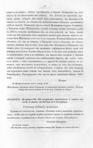 Высочайшие указы и повеления Императора Петра I, данные правительствующему сенату. Об отправлении президентов и членов коллегии с делами из Москвы в С.-Петербург. 22 января 1723 // Из архива правительствующего сената.