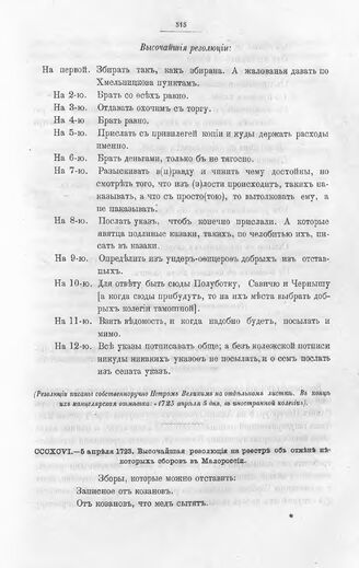 Высочайшие указы и повеления Императора Петра I, данные правительствующему сенату. Высочайшая резолюция на реестр об отмене некоторых сборов в Малороссии. 6 апреля 1723 // Из архива правительствующего сената.
