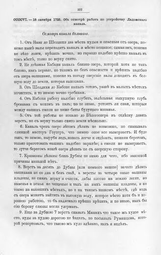 Высочайшие указы и повеления Императора Петра I, данные правительствующему сенату. Об осмотре работ по устройству Ладожского канала. В Питербурхе, октября в 18 день 1723