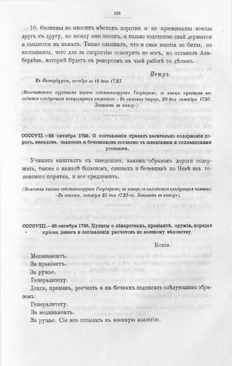 Высочайшие указы и повеления Императора Петра I, данные правительствующему сенату. Пункты о лекарствах, провианте, оружии, порядке приема денег и составлении расчетов по военному ведомству. Октября в 25 день 1723 года // Из архива правительствующего сената.