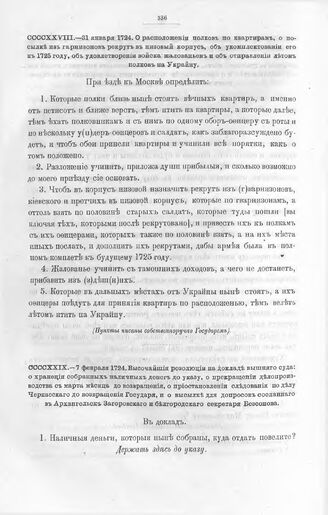 Высочайшие указы и повеления Императора Петра I, данные правительствующему сенату. О расположении полков по квартирам, о посылке из гарнизонов рекрут в низовый корпус, об укомплектовании его к 1725 году, об удовлетворении войска жалованьем и об отправлении летом полков на Украйну. 31 января 1724 // Из архива правительствующего сената.
