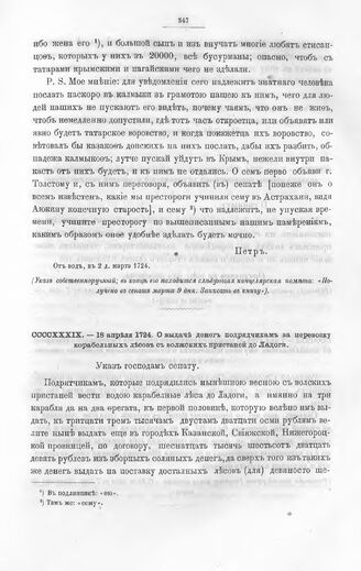Высочайшие указы и повеления Императора Петра I, данные правительствующему сенату. О выдаче денег подрядчикам за перевозку корабельных лесов с волжских пристаней до Ладоги. В 18 день апреля 1724-го, в Преображенском // Из архива правительствующего сената.