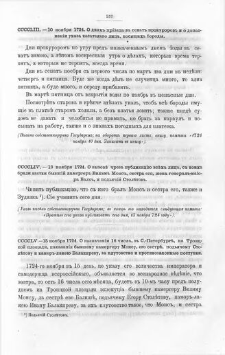 Высочайшие указы и повеления Императора Петра I, данные правительствующему сенату. О назначении 16 числа, в С.-Петербурге, на Троицкой площади, наказания бывшему камергеру Монсу, его сестре, подьячему Столетову и камер-лакею Балакиреву, за плутовство и противозаконные поступки. 1724-го ноября в 15 день // Из архива правительствующего сената.