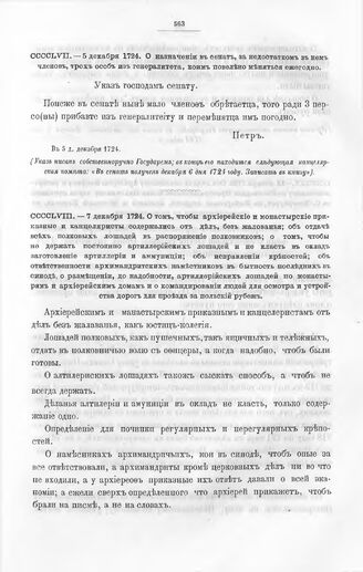 Высочайшие указы и повеления Императора Петра I, данные правительствующему сенату. О назначении в сенат, за недостатком в нем членов, трех особ из генералитета, коим повелено меняться ежегодно. В 5 д. декабря 1724 // Из архива правительствующего сената.