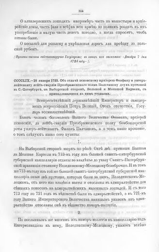Высочайшие указы и повеления Императора Петра I, данные правительствующему сенату. Об отдаче псковскому архиерею Феофану и унтер-лейтенанту лейб-гвардии Преображенского полка Пальчикову двух пустошей в С.-Петербурге, на Выборгской стороне, Большой и Меньшой Карвели, с принадлежащими к ним угодьями. Января 18 дня 1725 году