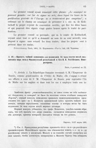 Проект тайной конвенции для подписания 24 часа спустя после подписания мира, между Французской республикой и Его И. В. Российским Императором. Париж, 15/27 марта 1801 г. // Pétersbourg. Paris, 1801, 75. Подлинник. Paris. 140, 139. Черновая.