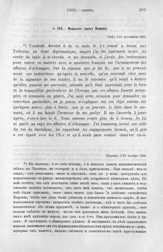 Морков графу Панину. Париж, 1/13 ноября 1801 г. // Pétersbourg. Paris, 1801, 274. Подлинник.