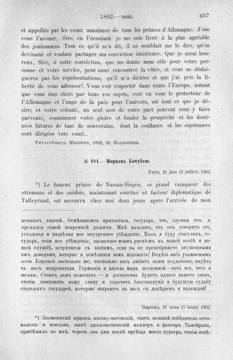 Морков Кочубею. Париж, 21 июня (3 июля) 1802 г. // Pétersbourg. Paris, 1802, 196. Подлинник.