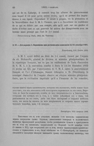 Декларация А. Воронцова при ратификации конвенции 14/26 декабря 1802. Петербург, 9/21 февраля 1803 // Paris, 142, 58. Подлинник. — Pétersbourg. France, 1803, 5. Черновая.