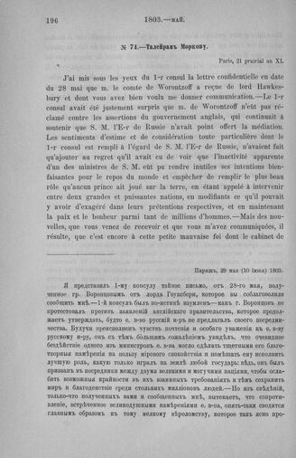 Талейран Моркову. Париж, 29 мая (10 июня) 1803 // Paris. 142, 148. Черновая. — Pétersbourg. Paris, 1803, 83. Список.