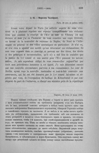 Морков Талейрану. Париж, 20 июня (2 июля) 1803 [2] // Paris. 142, 176. Подлинник. — Pétersbourg. Paris, 1803, 86. Список.