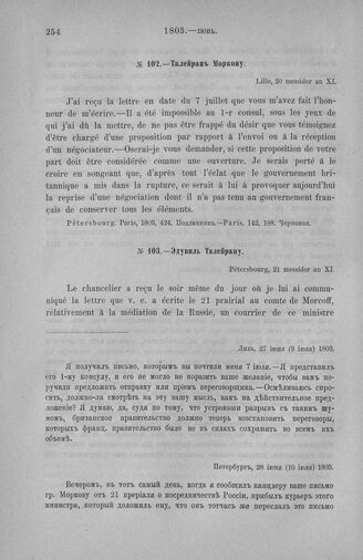 Талейран Моркову. Лиль, 27 июня (9 июля) 1803 // Pétersbourg. Paris, 1803, 424. Подлинник. — Paris. 142, 188. Черновая.