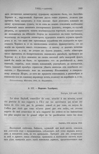 Морков Талейрану. Бареж, 3/15 августа 1803 // Paris. 142, 20—21. Подлинник. — Pétersbourg. Paris, 1803, 217. Список.